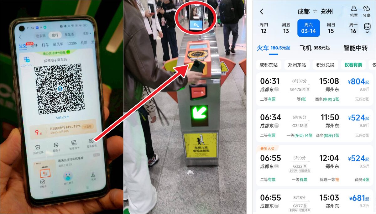 左:地下鉄の自動改札も交通カードのQRコードや顔認証で通過できる 右:Trip.comで、成都→鄭州の列車を検索するとたくさんの候補があり、予約可能。オール中国語だが、漢字の意味は大体わかるので操作は難しくない(パスポートの情報などが必要)
